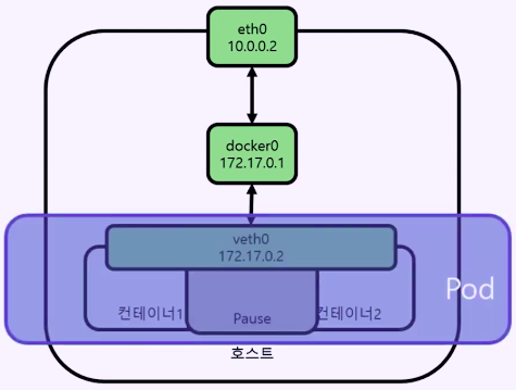 - 파드는 여러개의 컨테이너로 구성될 수 있는데 컨테이너들은 모두 동일한 IP를 부여 받을 수 있다. (pause 컨테이너를 이용)