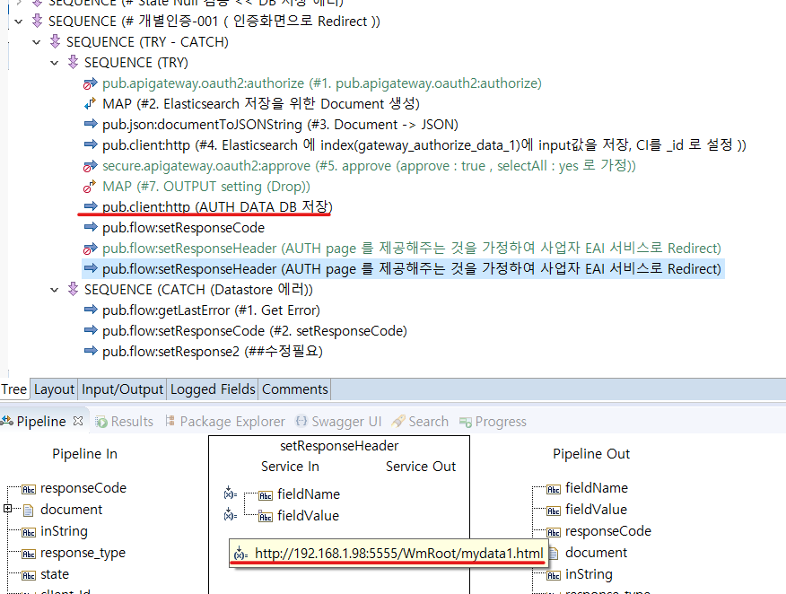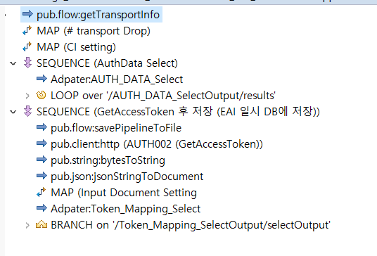- Request Header (x-api-tran-id , x-user-ci ) 값을 pub.flow:getTransportInfo 서비스를 이용하여 서비스 Input 값과 매핑