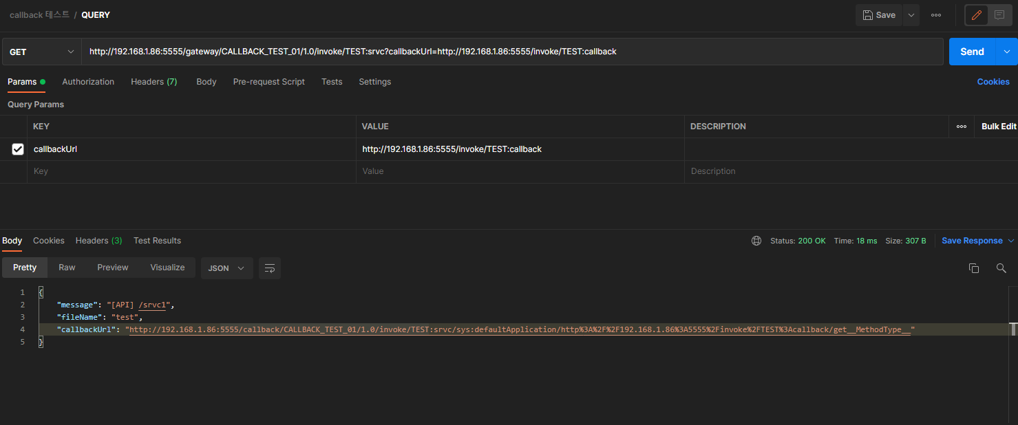 - 호출 결과 ( Gateway 의 API Calllback Processor 에 의한 url 래핑 결과 확인, 추가적인 callback 호출은 하지 않음)