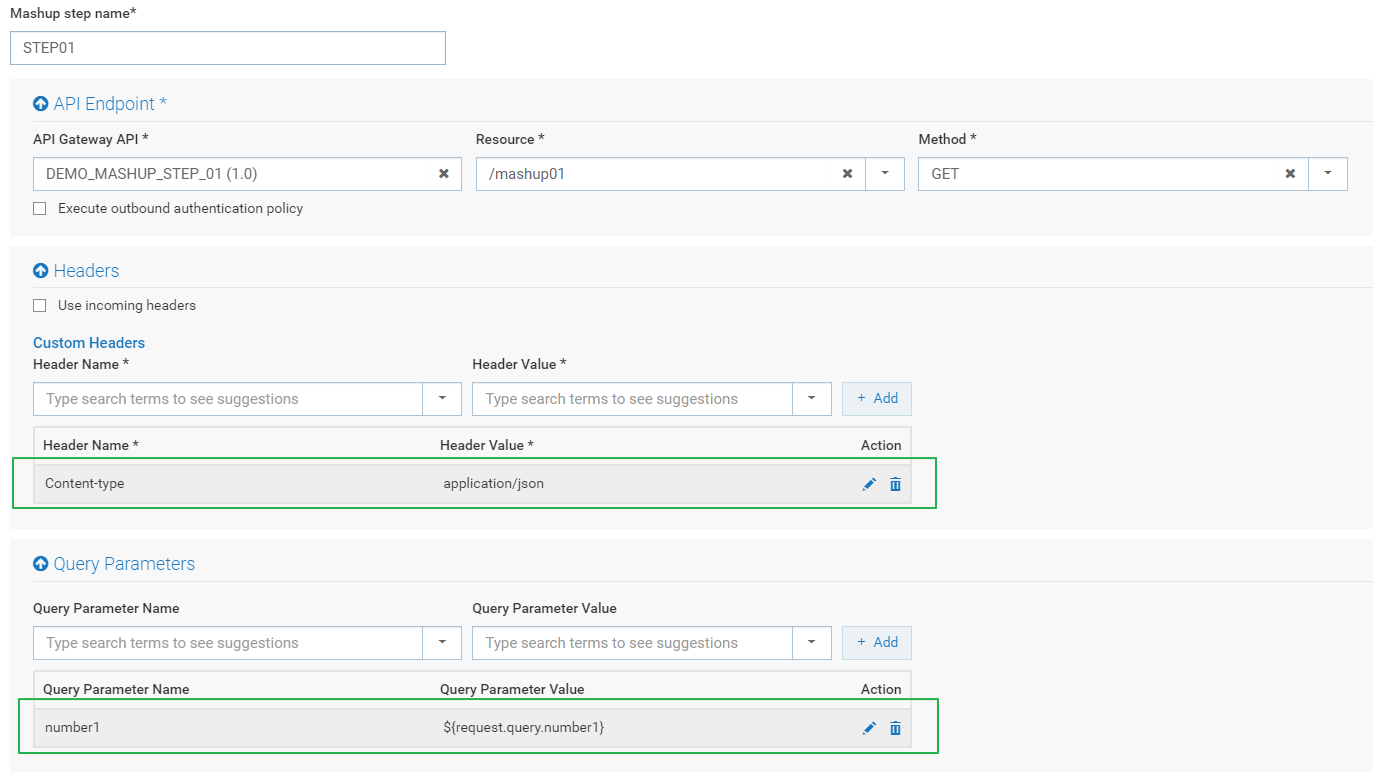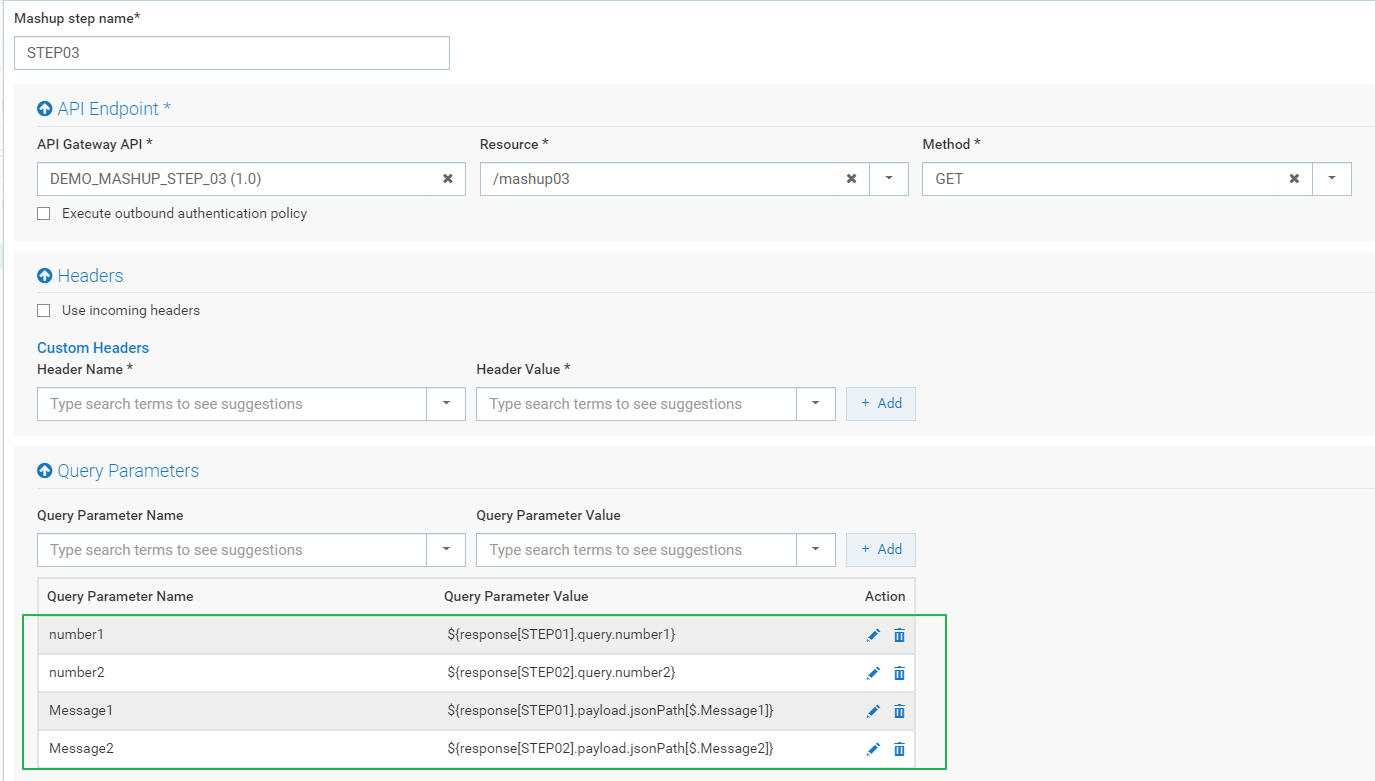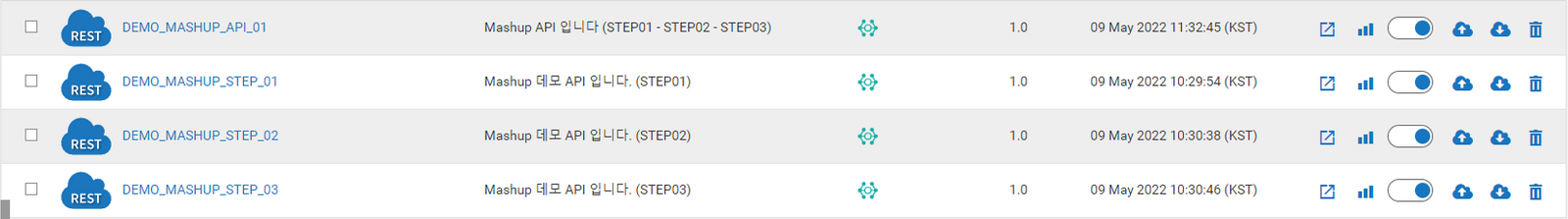 - Mashup API : DEMO_MASHUP_API_01 로 생성 ( Server 설정과 Resource Path 설정은 의미 X -> Mashup 기능으로 호출 될 것이기 때문에)