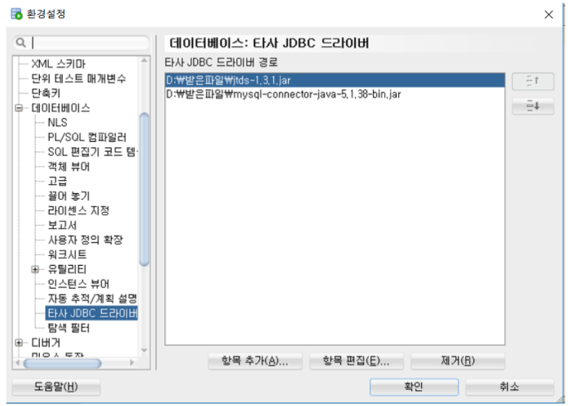 - JDBC 드라이버 다운로드는 각 Database 홈페이지 참고
