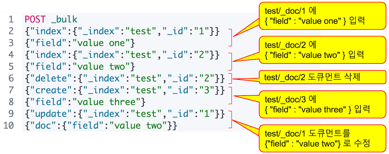 _bulk 명령 실행POST _bulk{"index":{"_index":"test", "_id":"1"}}{"field":"value one"}{"index":{"_index":"test", "_id":"2"}}{"field":"value two"}{"delete":{"_index":"test", "_id":"2"}}{"create":{"_index":"test", "_id":"3"}}{"field":"value three"}{"update":{"_index":"test", "_id":"1"}}{"doc":{"field":"value two"}}