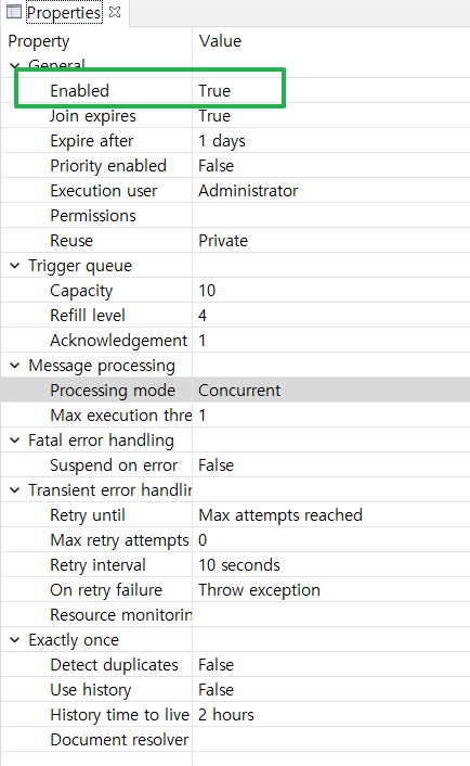 - Message Trigger의 Properties > Enabled : False -> True 로 변경