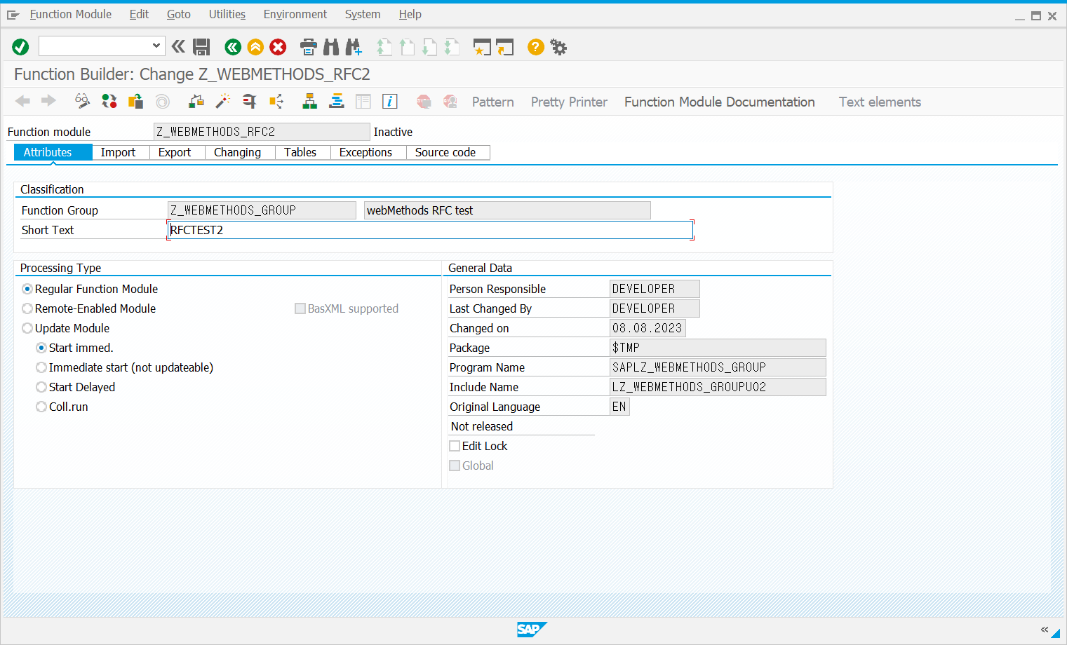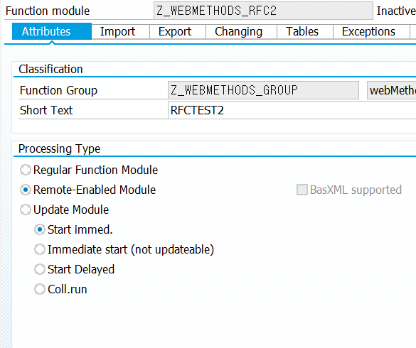 Attributes 에서 Remote-Enabled Module 로 설정하여 Non-SAP 시스템에서 해당 Function을 Call 할 수 있도록 설정