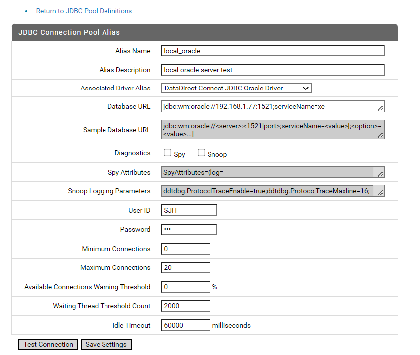 - Administration > JDBC pools > Create a Pool Alias Definition