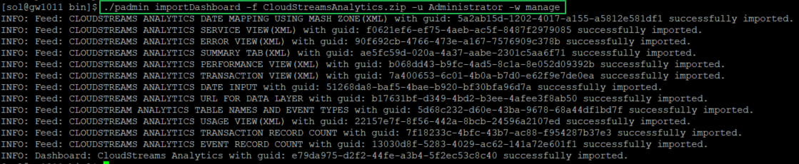 cd {MASHZONE_NG_HOME}/prestocli/bin./padmin importDashboard -f CloudStreamsAnalytics.zip -u Administrator -w manage