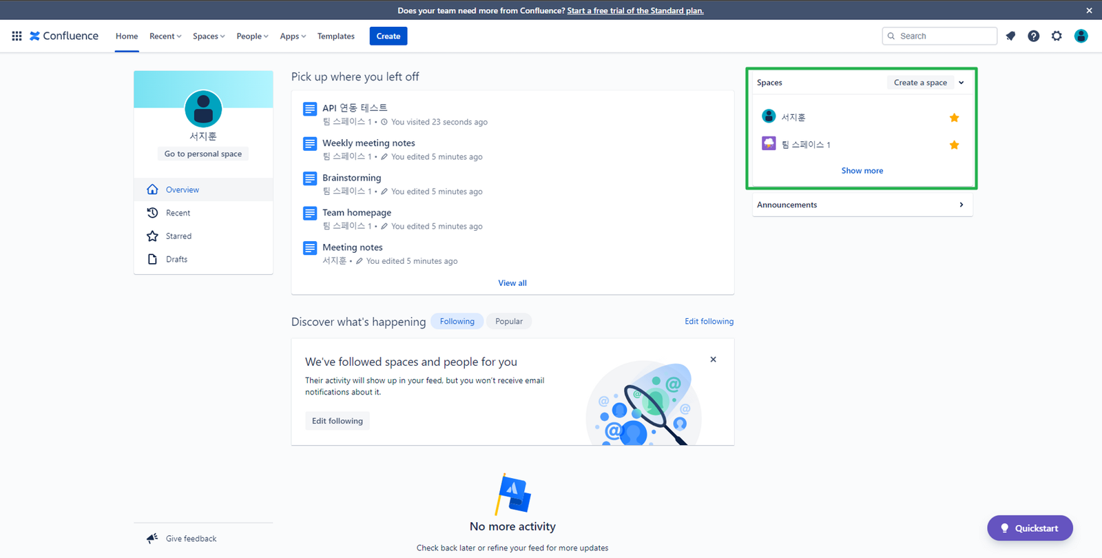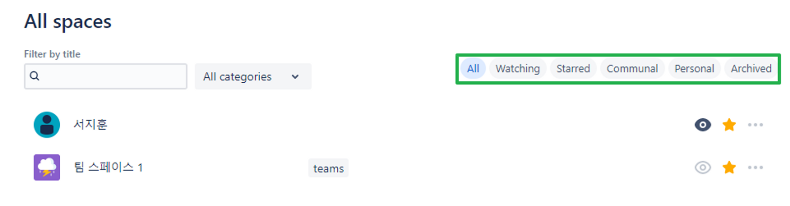 - Space 는 하나의 워크스페이스로 Personal Space 와 프로젝트 단위 팀 스페이스로 구분 됨