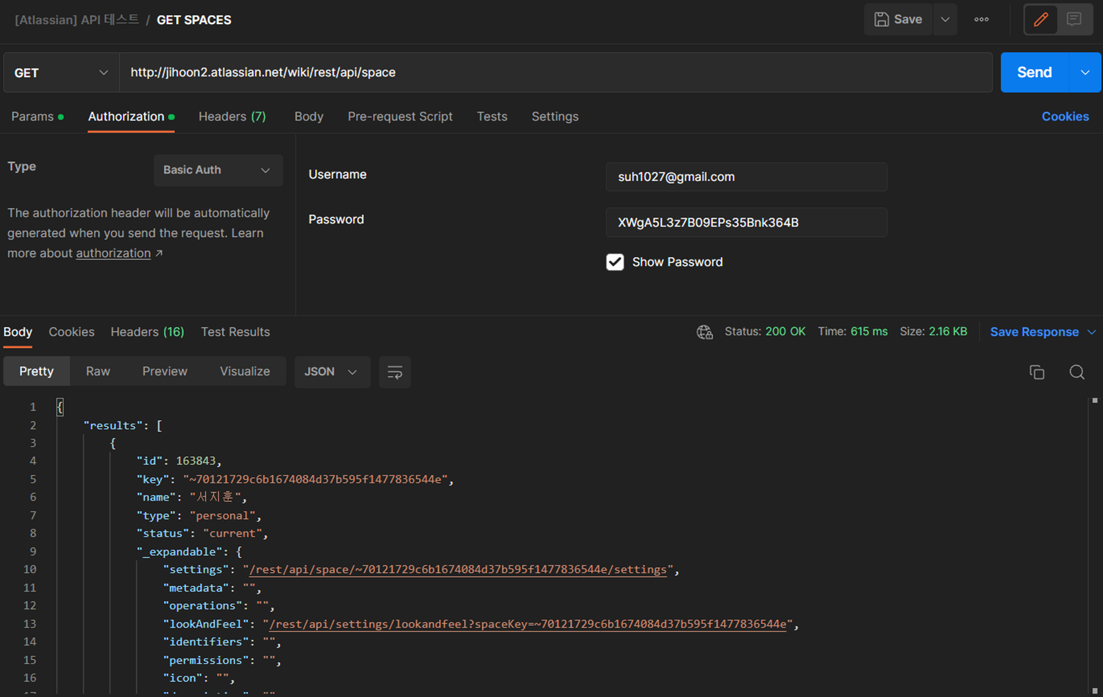 → Personal Space 의 Space key는 무작위로 생성 (위 Response의 ~로 시작하는)