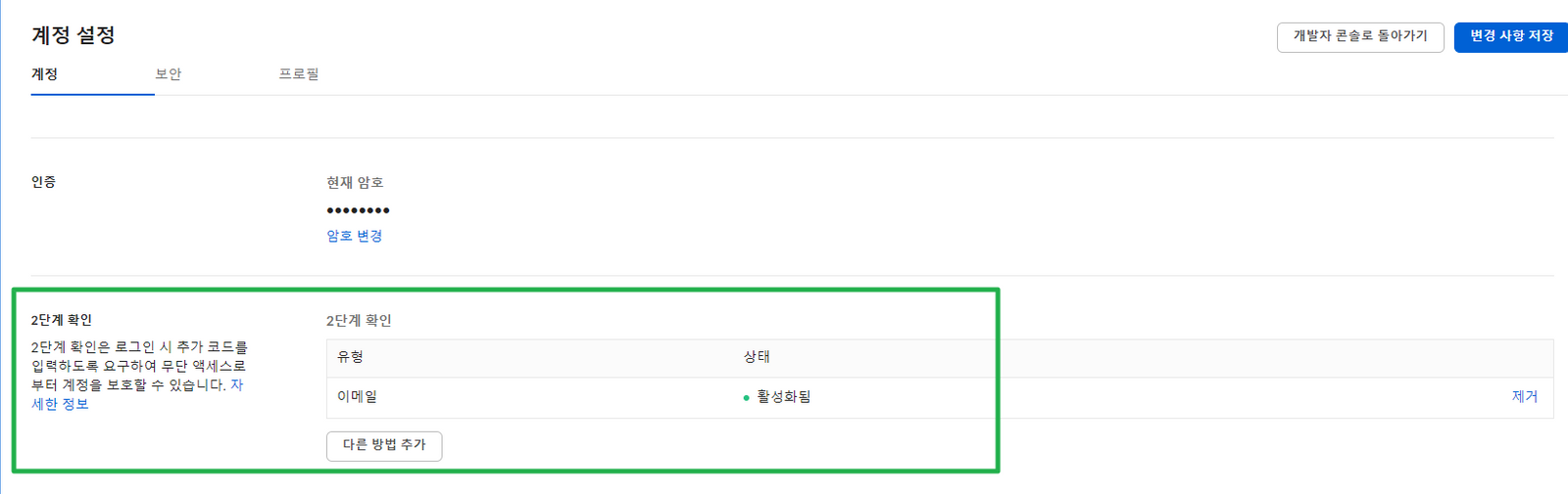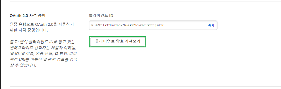 클라이언트 암호 가져오기에는 2FA 인증이 필요하며, 편의상 이메일 추가인증 방식 선택