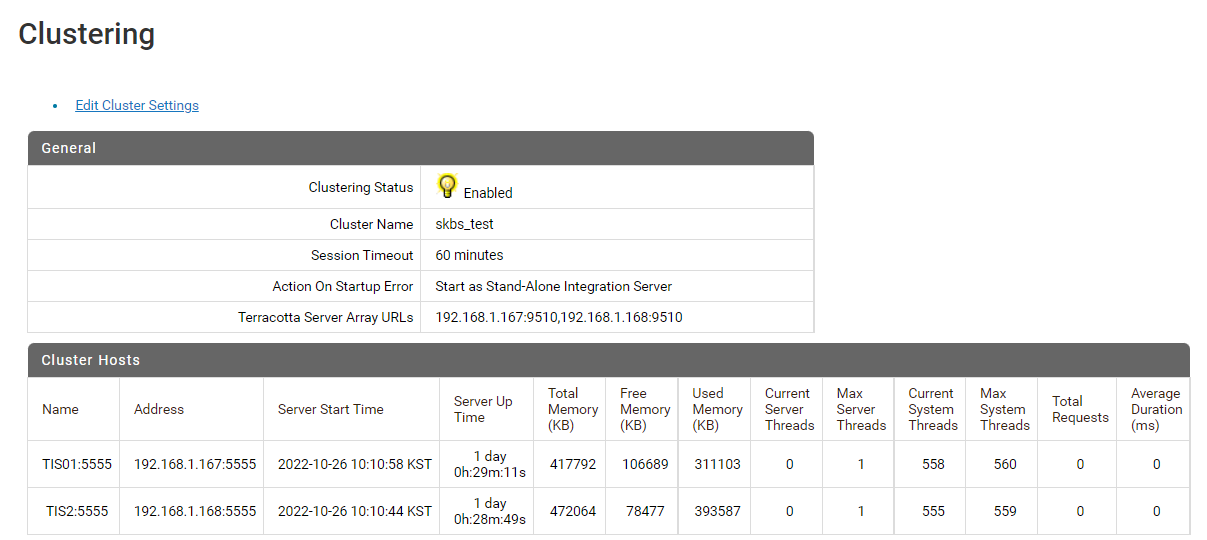 - Clustering (Terracotta Server Array) 되어 있는 Integration Server 두 대에서 테스트