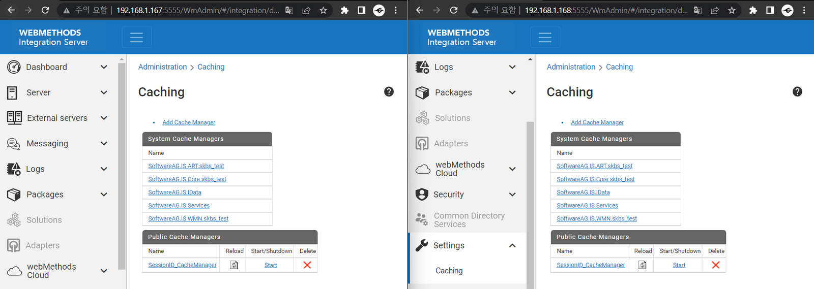 - 클러스터링 된 각 서버(IS01, IS02) 에 Cache Manager와 Cache 생성 (이름은 동일하게 구성)